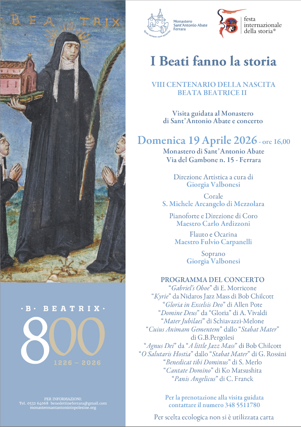 Il progetto si articola in due fasi: visita guidata al Monastero di Sant' Antonio in Polesine e alle opere contenute all'interno e concerto di musica sacra per voce solista, ensemble musicale e coro. L' evento nasce come commemorazione per gli 800 anni dalla nascita della Beata Beatrice II D'Este che fondò il Monastero di Sant'Antonio in Polesine a Ferrara, dedicandosi a una vita di preghiera, penitenza e servizio, diventando un punto di riferimento spirituale e lasciando in eredità il suo esempio di santità, carità e il prodigio delle lacrime.