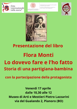 Si tratta della trascrizione di un'intervista alla partigiana Flora Monti corredata con illustrazioni e riferimenti storici pensati per un pubblico di giovani lettori. Si prevede la partecipazione della partigiana Flora Monti per raccontare la sua storia e per rispondere alle domande del pubblico.